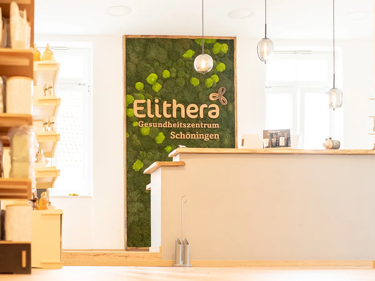 Entstanden ist eine wandhohes Moosbild mit massivem Eichenholzlogo, die Ruhe, Natürlichkeit und Wertigkeit ausstrahlt. Das Objekt fügt sich harmonisch in den Empfangsbereich ein und unterstreicht den ganzheitlichen Anspruch des Gesundheitszentrums Elithera.