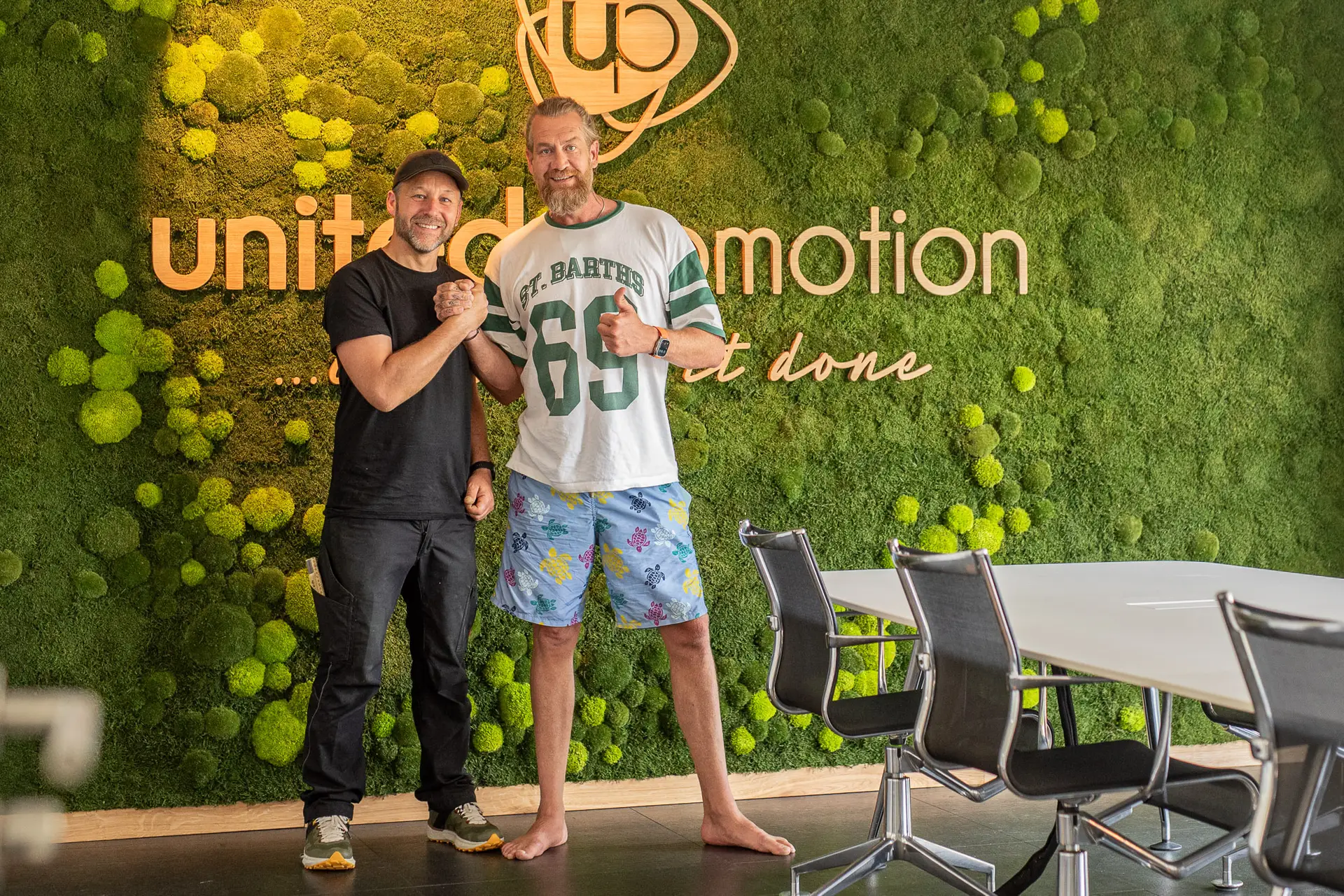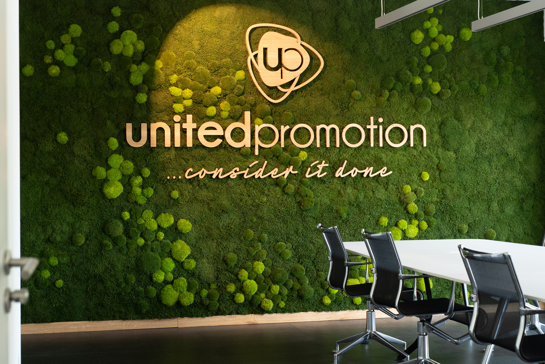 Die Wand sollte als dauerhaftes Gestaltungselement funktionieren, die Marke United Promotion klar im Raum verankern und Besprechungen sowie Kundentermine spürbar angenehmer machen.